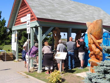 Déjà l’entrée à Ste-Luce-sur-Mer semble trop précoce. Avant la pause resto du midi, nous allongeons la randonnée jusqu’aux limites Est de Ste-Luce . Nous passons devant ces petites « cabins » de couleurs, les belles auberges et les abris de la promenade de l’Anse-aux-Coques où sont à l’œuvre les sculpteurs participants au symposium « Les sculpturales » qui a cours à la fin août.